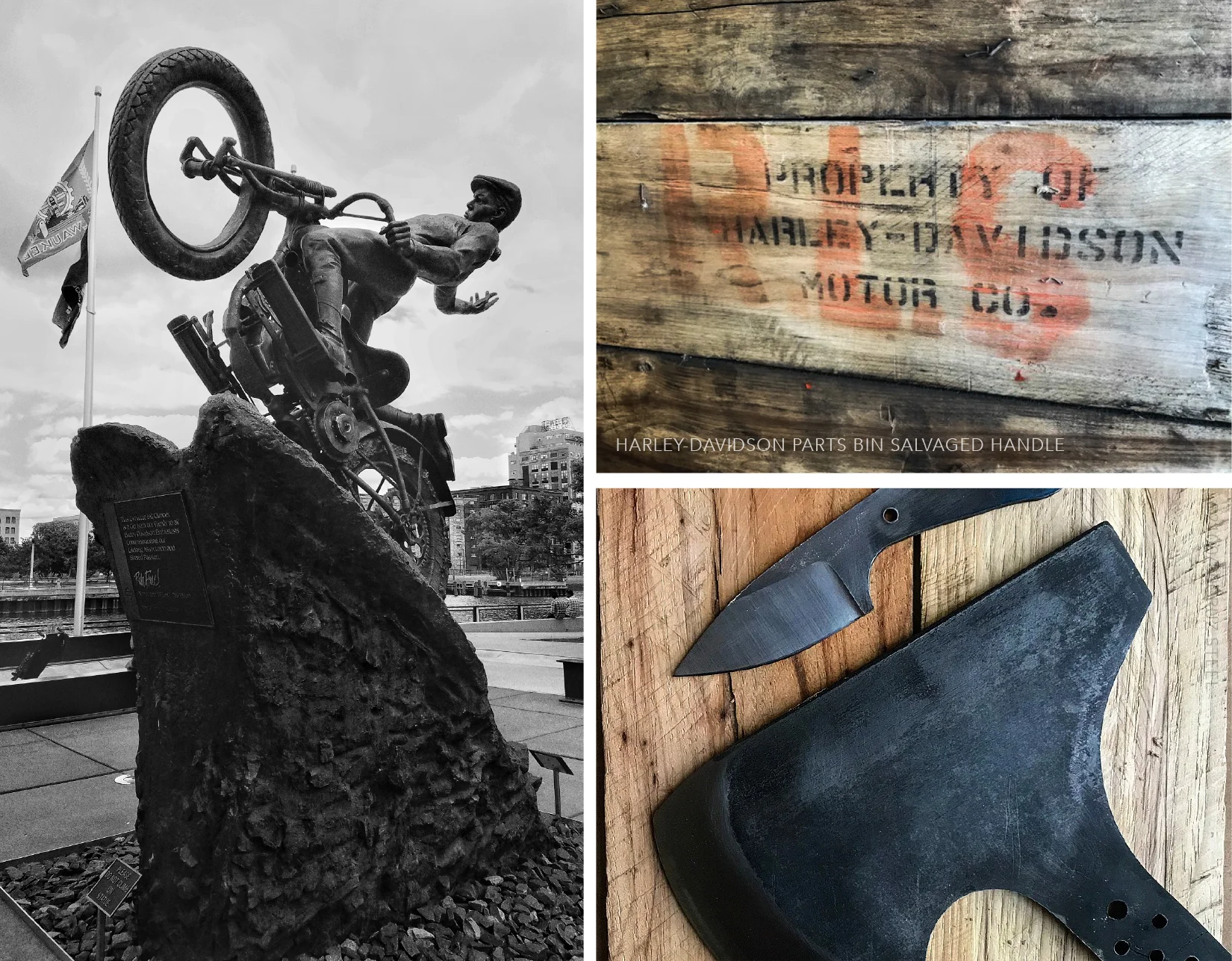 The material used in these pieces… only in Milwaukee; the home of Harley-Davidson is this story possible. We’ve produced our handles from salvaged Harley-Davidson parts bins.